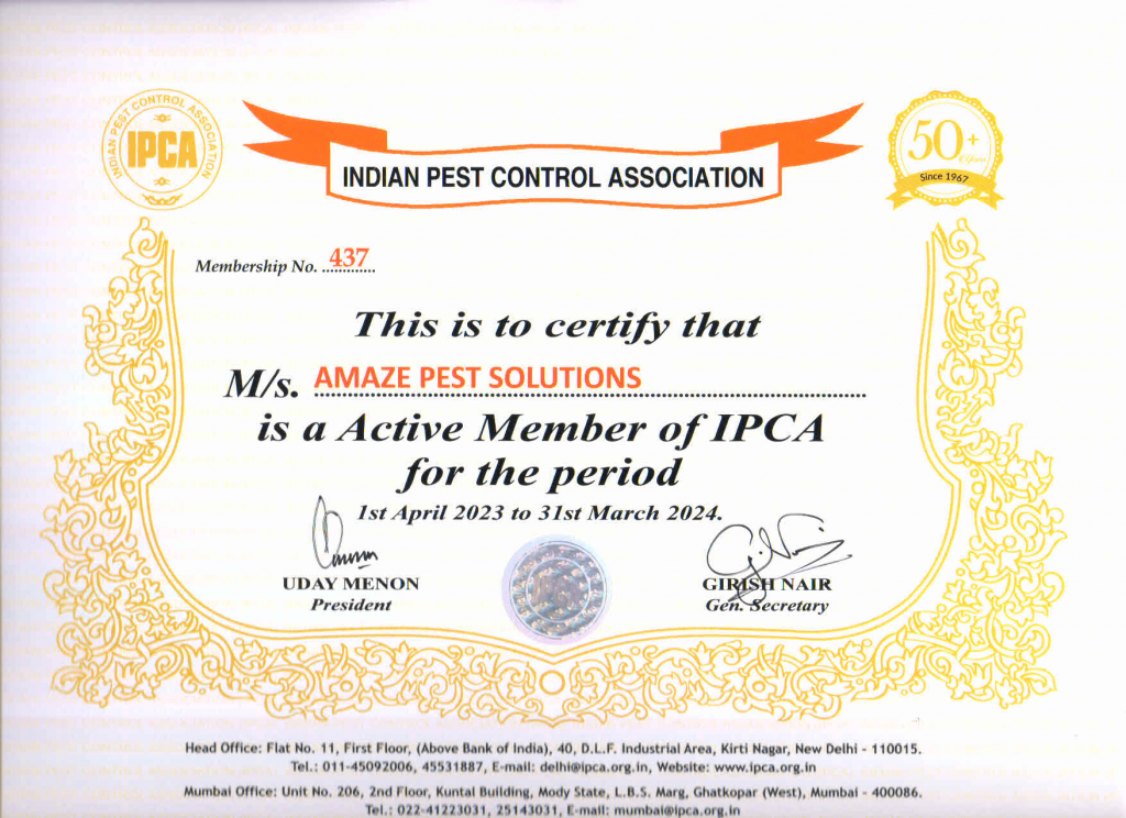 Apart from all the happy customers that Amaze Pest Solutions has gained over the years, one of the biggest successes of the company is that Amaze Pest Solutions is an active member of IPCA (Indian pest control association).